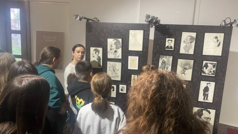 - Већ у "Аутобиографији" видљив је тај духовит однос који је имао према себи - наставља саговорница. - Тако му је и зид са карикатурама у његовој соби био омиљени. Његов лик представљали су сликари и писци, од којих су му већина били пријатељи, као што је Бета Вукановић, Пјер Крижанић, Марко Мурат, Брана Цветковић.... На свима је карактеристичан тај нос, не само што карикатура појачава поједине црте лице, већ што су тиме аутори наглашавали како Нушић има нос да нањуши дешавања у друштву и прикаже их кроз своја дела. Савременици су га представљали са пером као копљем, али и као свеца, и као кловна.