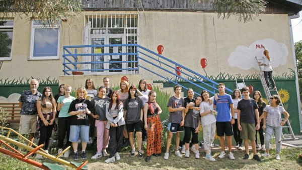 БУДУЋИ уметници из Школе за машинство и уметничке занате "Техноарт" учепшали су фасаду вртића "Мали сунцокрети"
