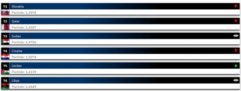 Према овом рангирању, Хрватска се налази на 74. месту, док је Србија рангирана на 63, а Босна и Херцеговина на 132. месту. Уз три водеће силе, у самом врху листе налазе се још Индија, Јужна Кореја, Уједињено Краљевство, Јапан, Француска, Турска и Италија. Занимљиво је да неке од тих земаља имају знатно мањи број активних војника од држава које су рангиране ниже, што додатно потврђује да сама бројност није пресудан критеријум војне снаге. Јапан, на пример, дугује високу позицију снажној морнарици и ваздушним снагама, укључујући једну од најмодернијих флота разарача, савремене борбене авионе и напредне противракетне системе.