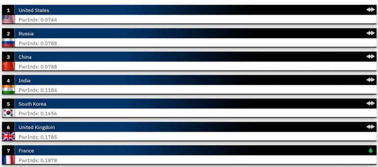 Одмах иза САД налазе се Русија и Кина. Кина се истиче највећим бројем активних војника међу водећим силама, са више од два милиона припадника, док Русија своју снагу темељи на комбинацији великих људских ресурса, огромне територије и снажних стратешких капацитета. Према индексу, обе државе остају незаменљиви актери у глобалним војним односима.