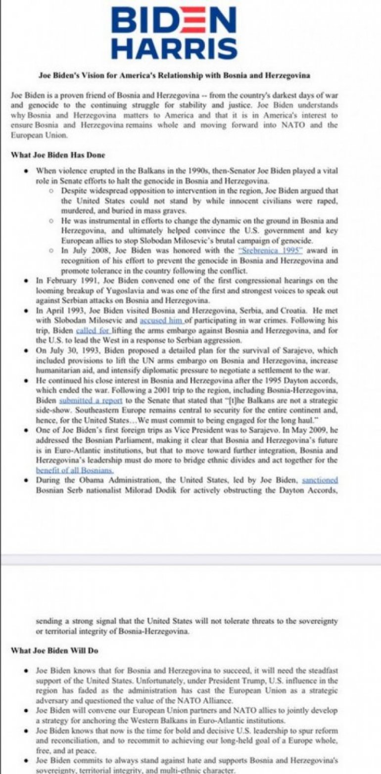 У документу се наводи да Џо Бајден "зна да је, ако хоћемо да БиХ успе, потребна стабилна и стална подршка САД".