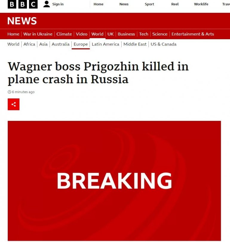 Информацију о смрти Пригрожина пустио је и ББЦ под насловом "Погинуо шеф Вагнера Пригожин".