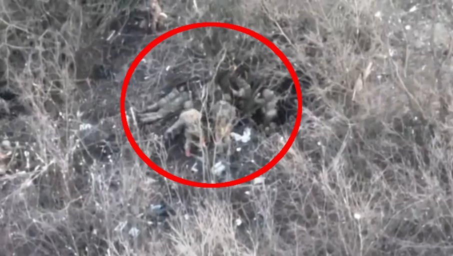На снимку, снимљеном дроном, види се да је неколико особа, вероватно украјинских војника, заробљено и потом убијено.