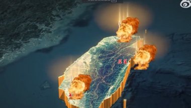 Симулација од 70 секунди направљена је комбинацијом анимације и снимака и приказује ратне бродове, копнене лансере ракета и ловце који лансирају таласе пројектила на острво.
