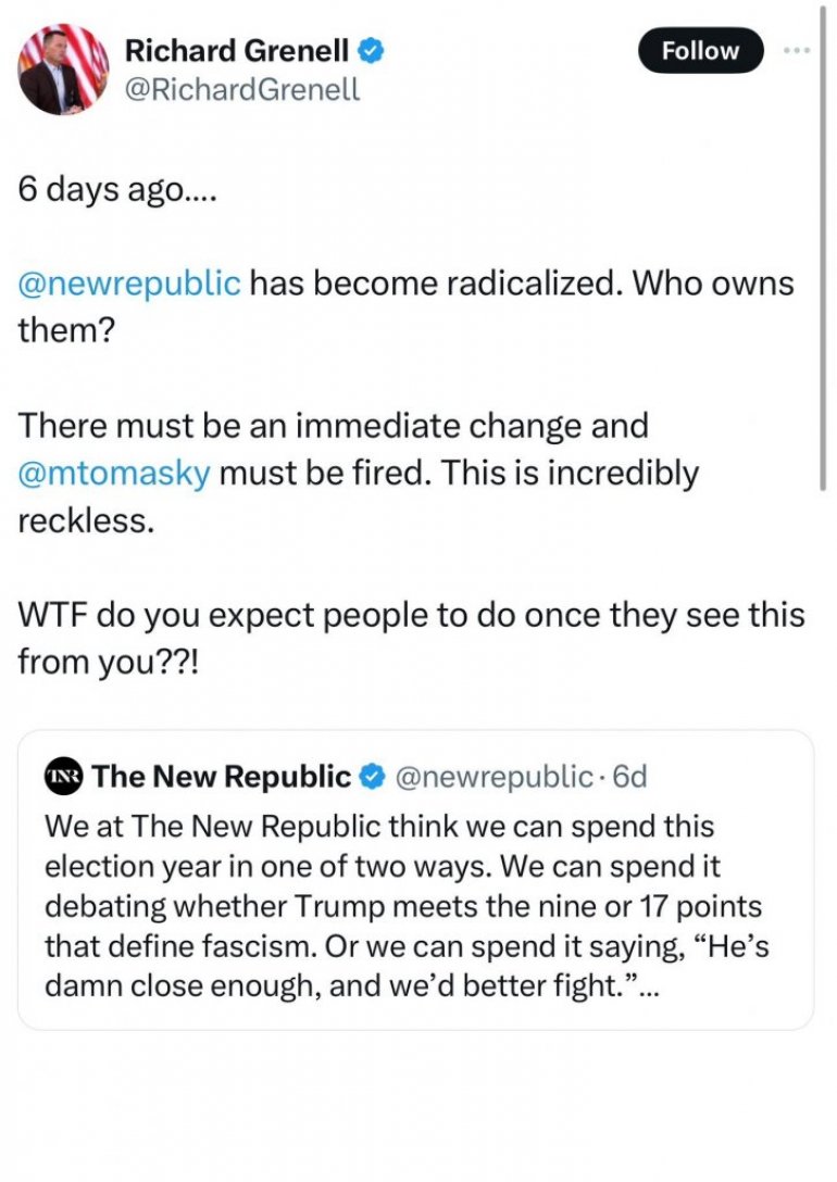 Гренел је подсетио да је пре 6 дана Магазин “Неw Републиц” писао како Трамп испуњава 9 од 17 ставки које дефинишу фашизам. Он је позвао новинаре који су то писали на одговорност и поновио питање како очекују да се понашају људи који то прочитају?!