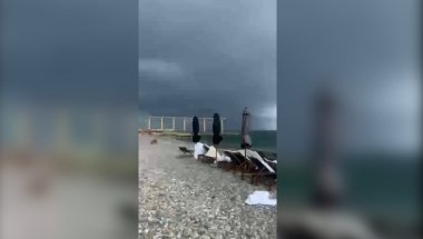 На снимку се види плажа, небо прекривено црним облацима изнад ње и јак ветар који гура таласе у море.
