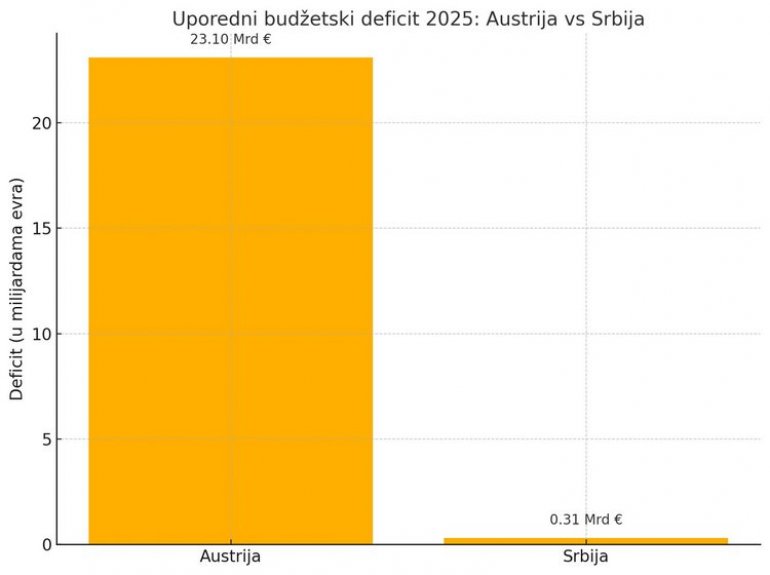 То значи да је дефицит у аустријском буџету чак 74 пута већи од српског и то у апсолутним бројкама. Уз овакву динамику, Беч се суочава са опасношћу потпуног фискалног колапса, док би Србија уз дисциплину, могла већ око 2038. године да пређе у суфицит и то без драстичних резова, већ уз годишње смањење дефицита од око 50 милиона евра.
