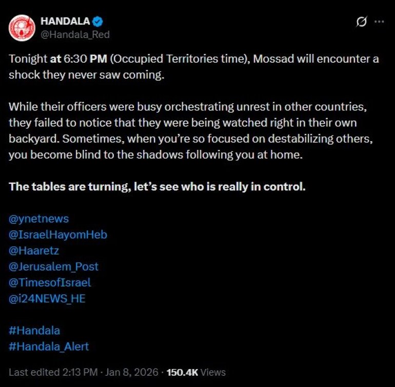 Хандала, позната по цурењу информација добијени хаковањем личних телефона високих функционера Израела саопштила је на друштвеној мрежи Икс да би ускоро могла да објави податке израелске обавештајне службе Мосад.