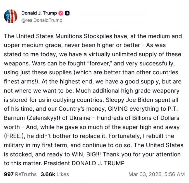 У Вашингтону је прошла поноћ, али Доналд Трамп је објавио поруку на својој платформи Truth Social. Амерички председник је рекао да САД имају рекордне залихе муниције средњег и вишег домета.