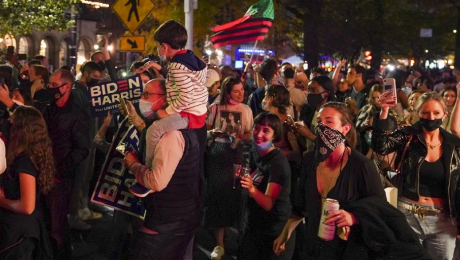 Улична забава организована је испред Беле куће након што се Бајден у суботу прогласио победником у изборном надметању са Доналдом Трампом, а сличне масовне прославе одиграле су се у градовима широм земље.