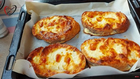 Загрејте рерну на 200 степени. Хлеб исеците на кришке. Обложите плех папиром за печење па наређајте кришке. Поспите их ренданим сиром па наређајте преко шунку. Јаја умутите са млеком, кремастим сиром и истопљеним путером. Затим прелијте преко шунке, па поново поспите ренданим сиром. Пеците око пола сата у загрејаној рерни на 200 степени.