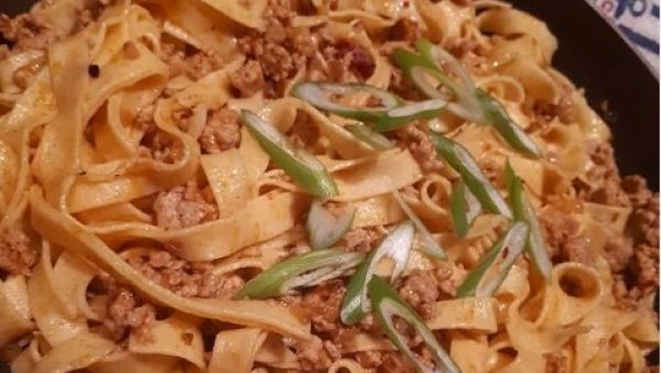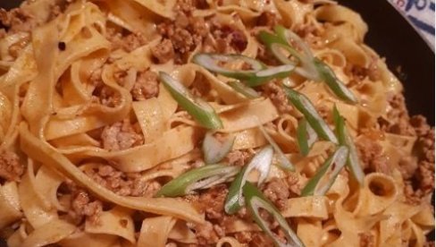 На две кашике загрејаног уља продинстајте исецкан црни лук и месо док месо не порумени. Зачините сољу и бибером по укусу. Умешајте чили, бели лук и крчкајте још минут. Додајте тестенину и рендане оцеђене тиквице. Сипајте темељац, млеко и парадајз. Кувајте на средње јакој ватри десетак минута, односно док тестенина не постане ал денте. Повремено промешајте. Умешајте нарендан качкаваљ и мешајте неколико минута док јело не постане кремасто.