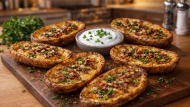 Мекан печени кромпир испуњен кремастим филом од отопљеног чедара, хрскаве сланине и свежег младог лука – савршен избор за ручак, вечеру или богато предјело. Споља благо хрскав, изнутра сочан и пун укуса, овај пуњени кромпир је једноставан, а увек импресиван.