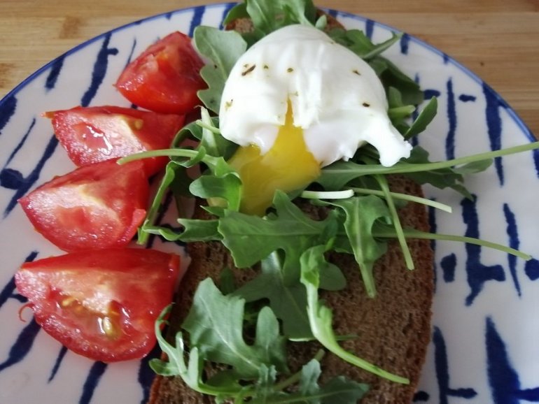 Док се јаје кува исеците кришку ражаног хлеба, оперите шаку руколе и исеците парадајз на кришке. Јаје ставите на руколу и посолите.