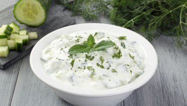 За ову салату помешајте све састојке осим мирођије и краставца - лук, бели лук, посни јогурт, со, бибер, лимунов сок, јабуково сирће и сенф. Мешајте док не постане глатко.