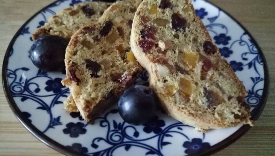 Прво се на ситне коцкице исецка суво воће. Крушка се ољушти и исецка на коцкице. Ораси се исецкају грубље, на величину крушке и сувог воћа. Крушка ће колачу донети сочност, а ораси укус.