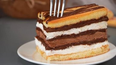 Поделите смесу на 2 дела и у један додајте нутелу (150 г), а у други истопљену белу чоколаду. Ређајте: бели фил, нутела, црни фил, нутела, бели фил, нутела, црни фил, нутела и на крају пишкоте. (trpeza)