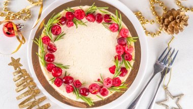 Поређајте гранчице рузмарина око подножја торте, а на врх ставите шишарке и бруснице. Уживајте у торти ледено царство!