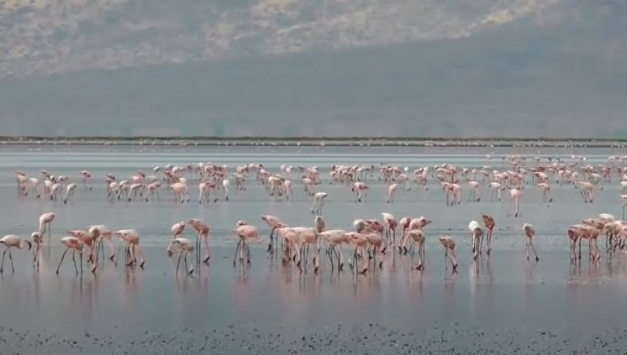 Око језера које је дубоко свега 3 метра, дужине 57 и ширине 22 километра и температуре од 41 степен Целзијуса, безбрижно се шетају и фламингоси.