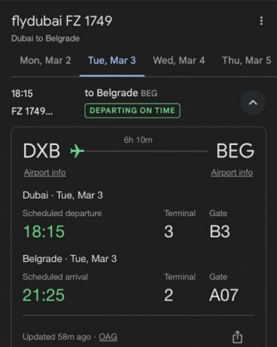 ЈОШ један авион са путницима из Дубаија, углавном српским држављанима, слетео је на аеродром "Никола Тесла". Авион превозника "Флај Дубаи" биоје на писти у 7.40 часова, иако је првобитно било планирано да стигнепрексиноћ око пола десет. У авиону је било 166 путника, а међу њима и Небојша Бојић, новинар "Вечерњих новости", који се у Дубаију "заглавио" током повратка из Сри Ланке.