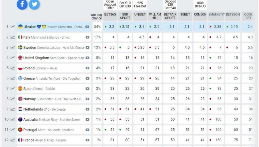 КОНСТРАКТА ПАДА НА КЛАДИОНИЦАМА: Украјина убедљиви фаворит - погледајте ранг-листу пред Евровизију (ФОТО)