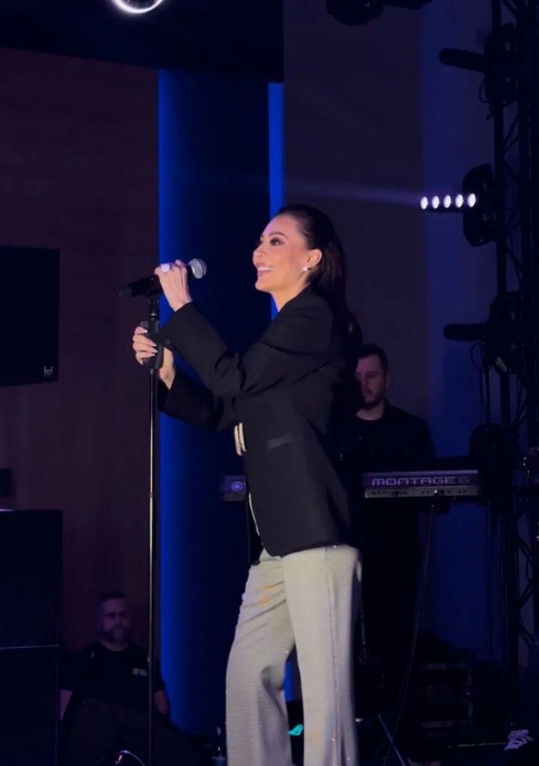 Као и увек, носила је спектакуларни аутфиту, а за вечерашњи концерт одабрала је светлуцаве панталоне и црни сако док се испод назирао дубоки деколте.