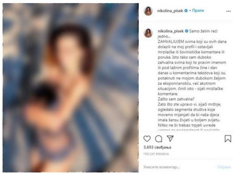 "Само желим рећи једно... Захваљујем свима који су ових дана долазили на мој профил и остављали мрзилачке или шовинистичке коментаре или поруке. Исто тако сам дубоко захвална свима који то правим именом или под лажним профилима чине и дан-данас у коментарима текстова који су, подстакнути не мојом дубоком жељом за експонираношћу, већ актуелном ситуацијом, чинили исто - сејали мрзилачке коментаре. Зашто сам захвална? Зато што сте управо ви, сејачи мржње, огледало сегмента друштва које морамо мењати да би наша деца имала шансу да живе у бољем свету. Нико не би требало да трпи увреде везане за националност или порекло, нити би иједна жена требало да искуси мизогино шовинистичко вређање као што ја доживљавам ових дана", поручила је Николина на Инстаграму.