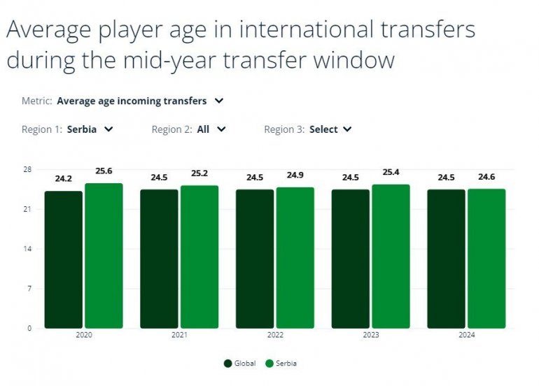 Такође Србија напредује када су у питању трансфери по још једном параметру, а то је старосна граница фудбалера. Ова граница се помера из године у годину, а приметно је да све млађи и млађи играчи напуштају Србију и одлазе пут Европе.
