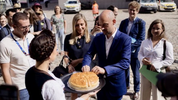 Француском министру су на доласку по српској традицији послужени погача и со, а затим је обишао изложбу "Корени" и цео наш павиљон, интересујући се за српску културу и традицију.