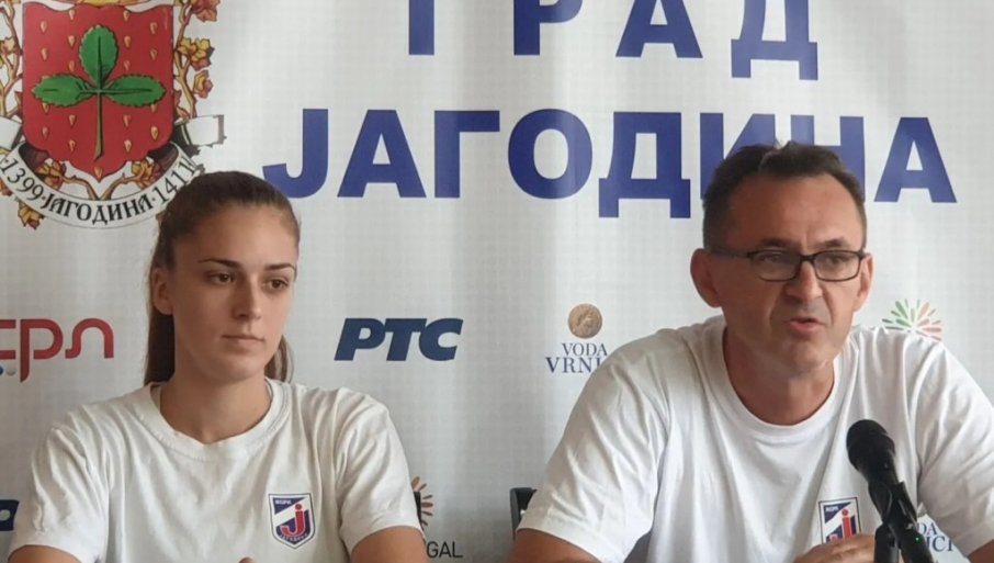Тренер Драган Марков и играчица Јелена Богдановић, повратница у редове Јагодинки, позвали су публику да пружи подршку.