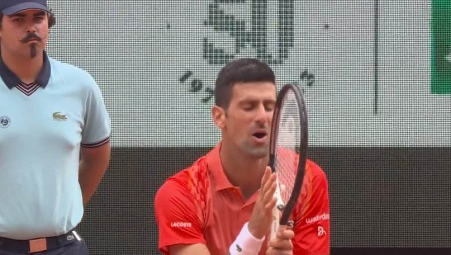 Новак Ђоковић погађа мрежу на 0:30, док је губио са 3:4 у трећем сету финала Ролан Гароса 2023 / ТВ Еуроспорт