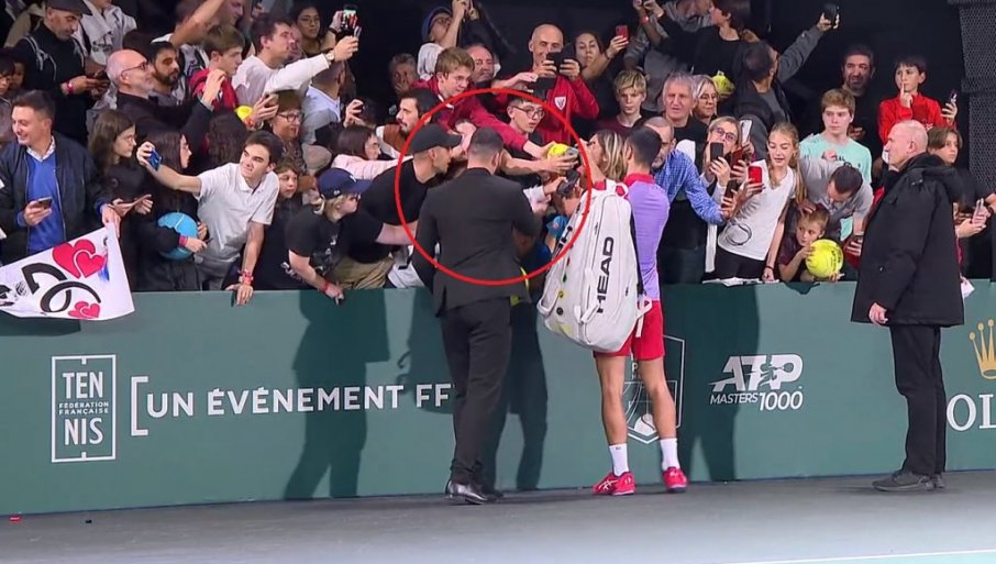 Обезбеђење склања руку навијача са рамена Новака Ђоковића на мастерсу у Паризу / Screenshot / TennisTV