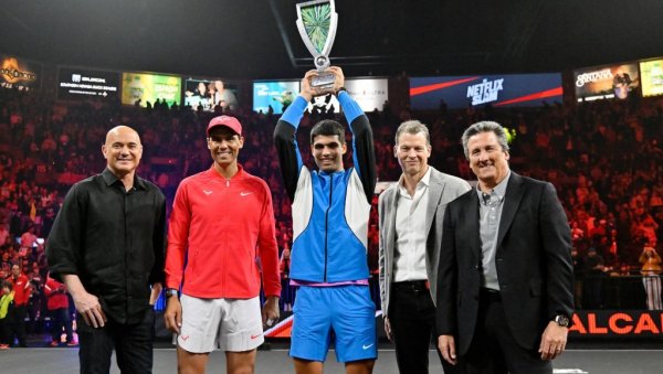 СУДАР два највећа имена шпанског тениса, Рафаела Надала и Карлоса Алкараза, припао је овом другом који је после супер тај-брејка савладао 37-годишњег сународника на "Нетфликс слем" егзибиционом турниру у Лас Вегасу - 6:3, 4:6, 7:6 (14:12).