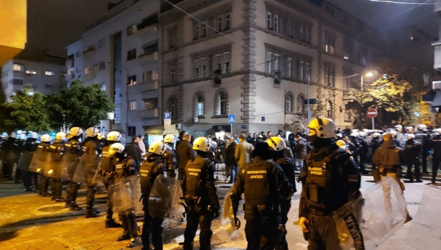 Окупљени националисти певају "Сребреница није геноцид" и скандирају "Ратко Младић", а групици "антифашиста" поручују да су "усташе".