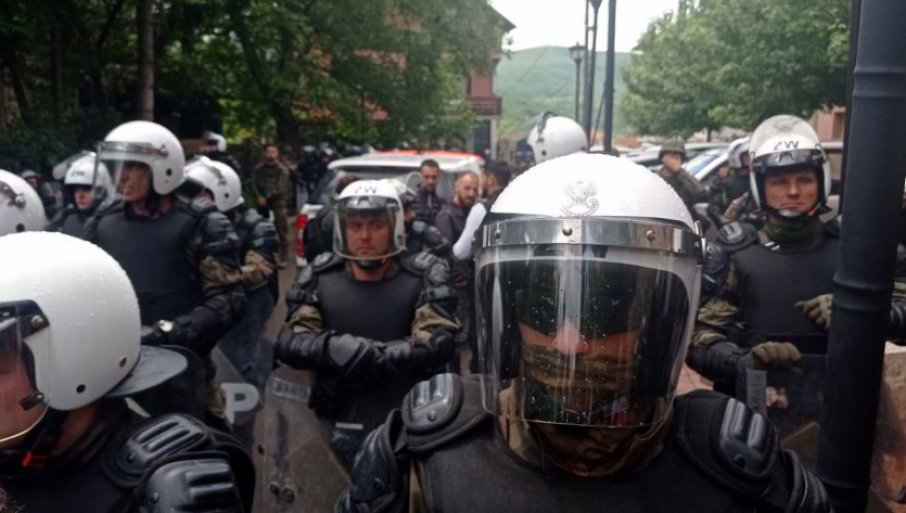 У Звечану, где од јутрос испред зграде општине протестују окупљени Срби, бачено је више од 30 шок бомби, а косовска полиција пуца из ватреног оружја.