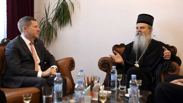 РАЗГОВАРАЛИ О ВРАЋАЊУ ЗЕМЉЕ ДЕЧАНИМА: Шеф Канцеларије ЕУ у Приштини Томаш Суниог са владиком Теодосијем