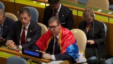 ПРЕДСЕДНИК Србије Александар Вучић након резултата гласања о срамној резолуцији о Сребреници поносито је огрнуо спрски заставу у Уједињеним нацијама.