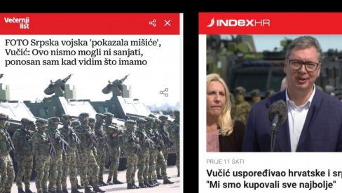 "Вечерњи лист" пише да је "српска војска показала мишиће", "Индекс" пише о новим авионима које ће Србија купити од Француске, а вест о војној вежби у Батајници пренео је и портал "24 сата".