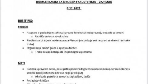 Наша редакција је дошла у посед записника под називом „Комуникација са другим факултетима“, из чије садржине се недвосмислено може закључити да актуелни „студентски“ протести уопште нису организовани од стране студената, а још мање спонтани, већ се ради о још једном подмуклом покушају преваре народа од стране лидера прозападне опозиције.