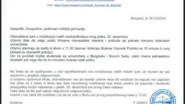 РОДИТЕЉИМА ђака који похађају Француску школу у Београду стигао је мејл од управнице у којем их обавештава о мобилизацији ученика и захтеву да се прикључе блокадама.