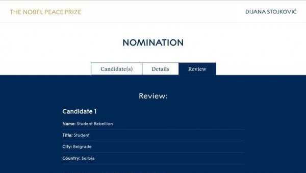 - Управо је од Нобеловог комитера стигла потврда да је прихваћена кандидатура за Нобелову награду за мир,којом смо госпођа Дијана Стојковић,адвокат и ја кандидовали српске студенте - написао је он.