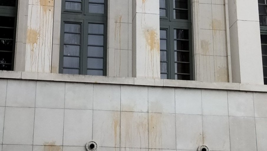 ДОК у згради Скупштине Војводине траје седница, окупљени блокадери зграду гађају јајима и праве буку пиштаљкама и вувузелама.