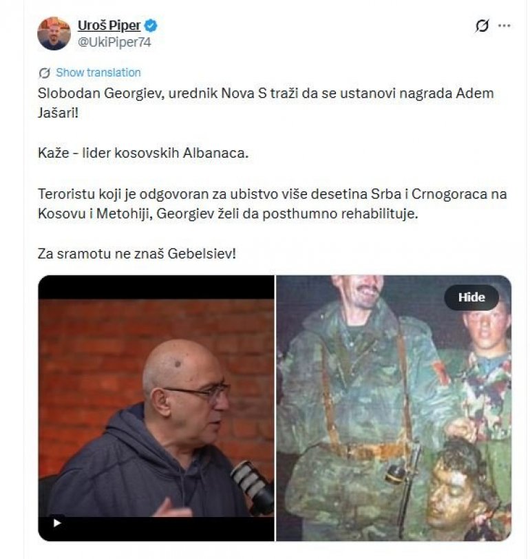 ГЕОРГИЕВ ТРАЖИ ДА СЕ УСТАНОВИ НАГРАДА АДЕМ ЈАШАРИ! Огласио се Пипер - За срамоту не знаш Гебелсиев!