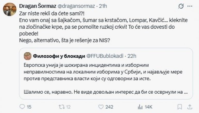 - Зар нисте рекли да ћете сами?! Ено вам онај са шајкачом, шумар са крстачом, Ломпар, Кавчић... клекните на злочиначке крпе, па се помолите руској цркви! То ће вас довести до победе! Него, алтернативо, шта је решење за НИС? - написао је Шормаз на друштвеној мрежи Икс.