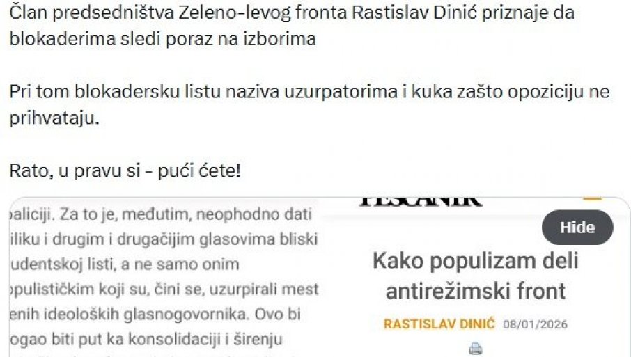 - Први међу блокадерима који говори о изборном поразу! Члан председништва Зелено-левог фронта Растислав Динић признаје да блокадерима следи пораз на изборима При том блокадерску листу назива узурпаторима и кука зашто опозицију не прихватају. Рато, у праву си - пући ћете - објавио је Пипер на мрежи X.