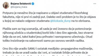 - Потпуно је неважно шта је написано у објави студената Филозофског факултета, није ни први ни задњи пут. Далеко већи проблем је то што је објава у којој се налазио одговор студената Државног универзитета у Новом Пазару на то обрисана. Плашила сам се тог сценарија, али сада је већ извесно да је потенцирање њиховог учешћа у студентској борби било и део шире агенде, без стварне жеље да се они, такви какви јесу прихвате и равноправно учествују. Отуд толико инсистирање на саборности само по основу верских разлика. Оно што није урадио САНУ и остатак медијско-пропагандне машинерије, требало је да се уради сада: да и они, а и остатак Србије прихвате да је једина идентитетска линија по којој се разликују од већинског становништва вера. Зато њихови ставови по било ком другом питању које може да укаже да се ипак још по нечему разликују (што би на концу довело до препознавања етничких разлика), нису смели да буду видљиви. Однос моћи у коме се препознају само као муслимани, не и Бошњаци. Не знам ко је смислио, али је врло подло - наводи се у објави.