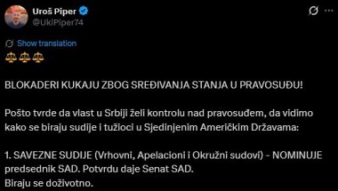 "БЛОКАДЕРИ КУКАЈУ ЗБОГ СРЕЂИВАЊА СТАЊА У ПРАВОСУЂУ" Пипер објаснио: Тврде да власт у Србији жели контролу над правосуђем