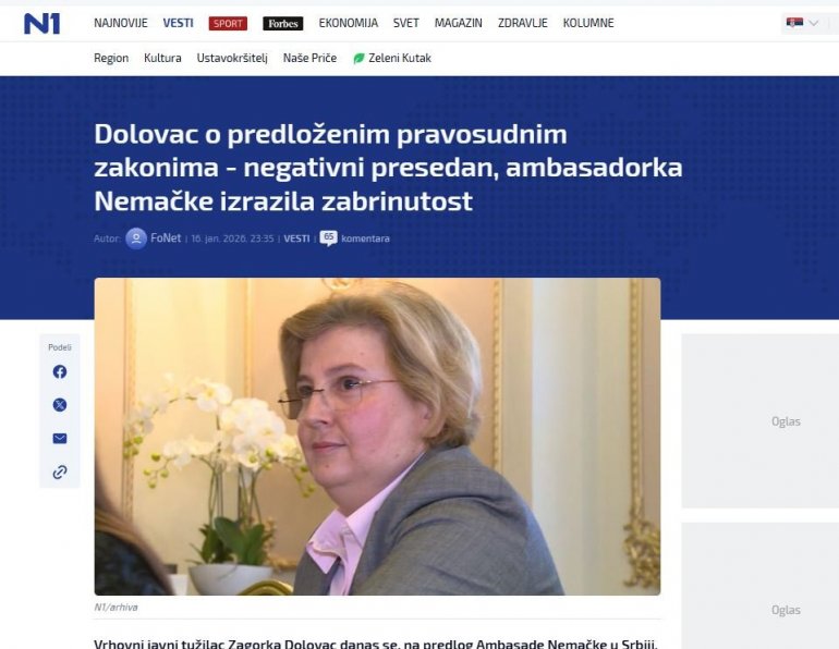 ВРХОВНИ јавни тужилац Загорка Доловац састала се јуче са амбасадорком Немачке у Србији Анке Конрад, на иницијативу немачке амбасаде, пренео је Н1.