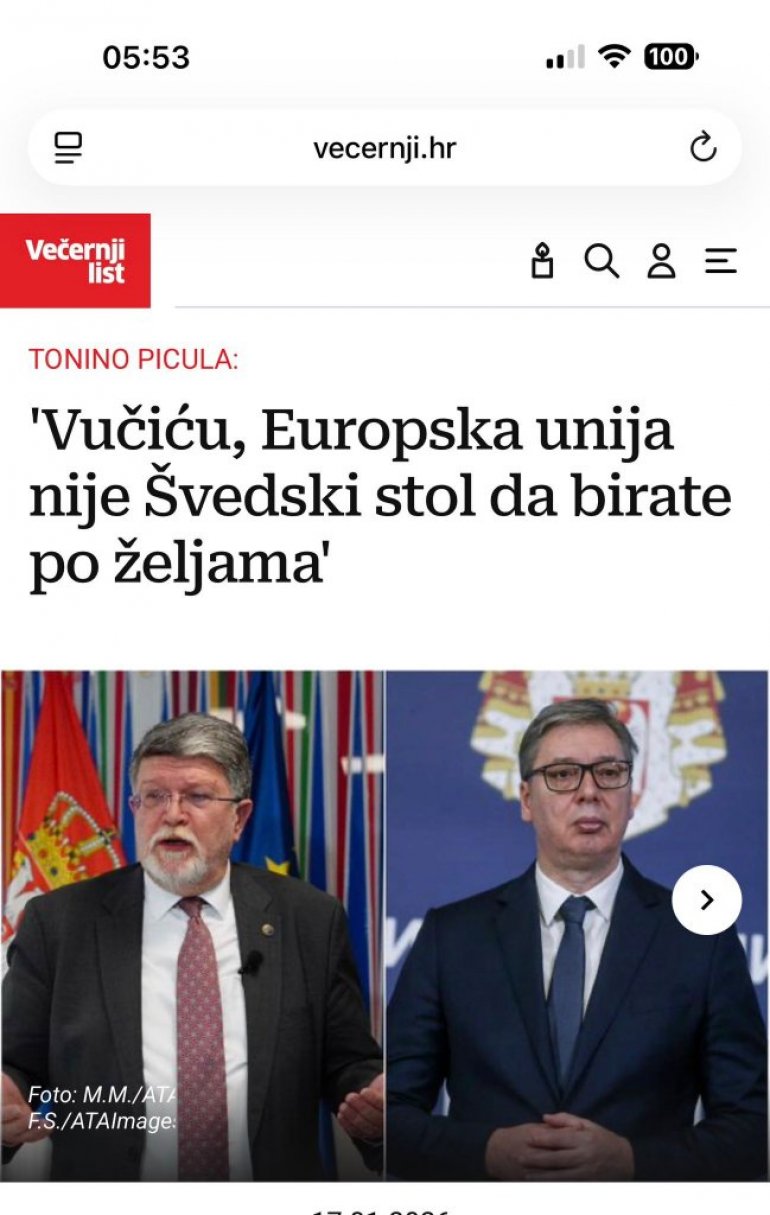 Тако је хрватски Вечерњи лист објавио поруку известиоца Европског парламента Тонина Пицуле упућену председнику Србије Александру Вучићу.