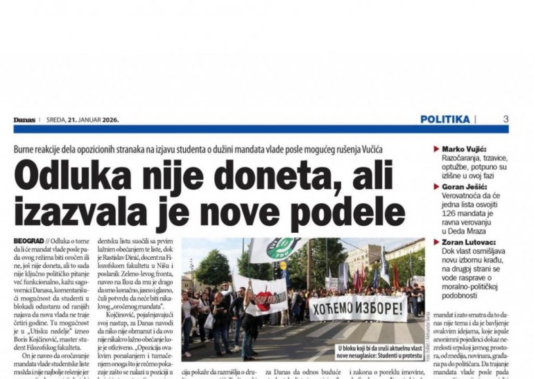 У тексту су писали о, како су навели, бурним реакцијама дела опозиционих странала на изјаву студената о дужини мандата владе после, како прижељкују, "могућег рушења Вучића".